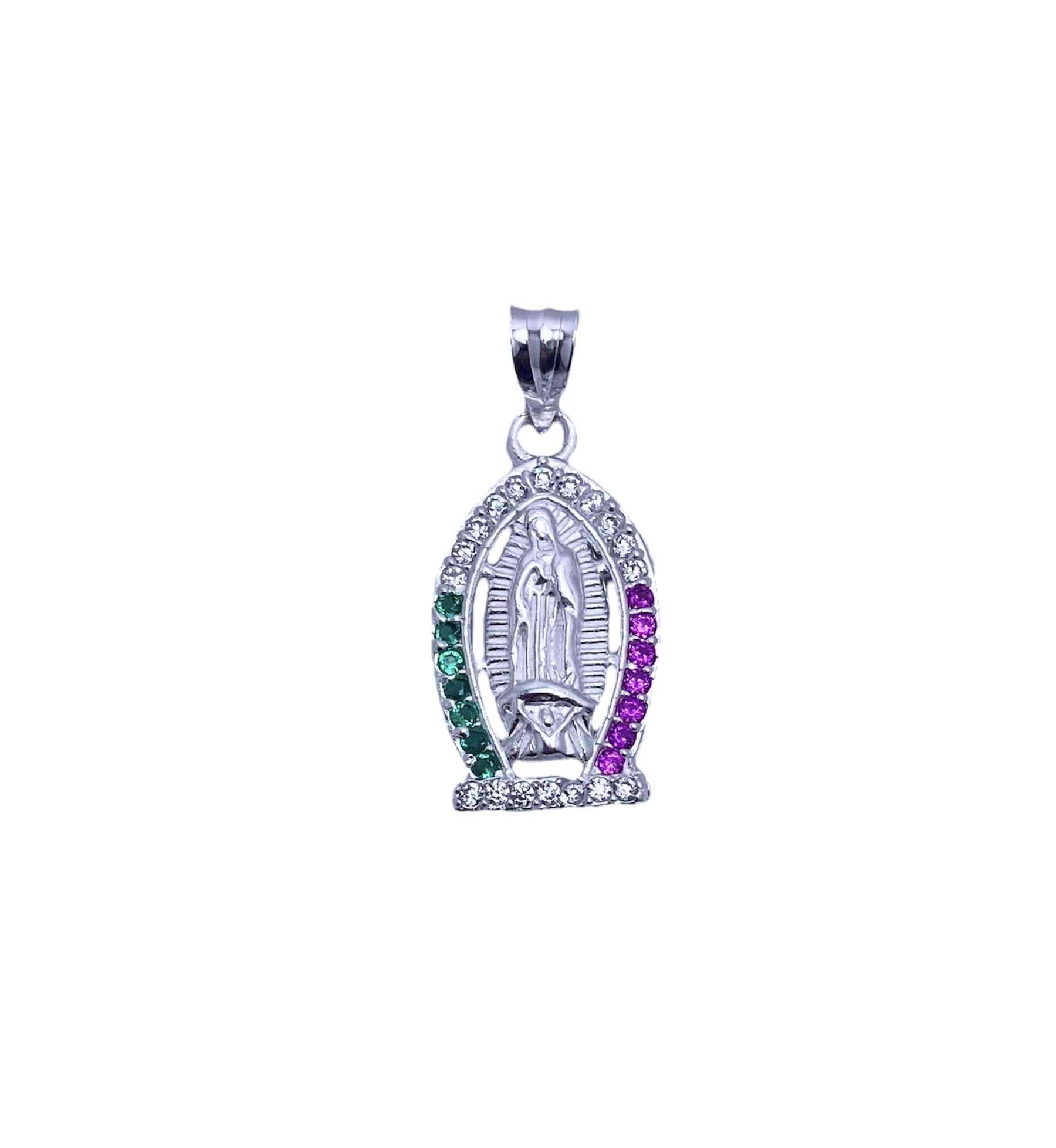 925 Mexican Sterling Silver Small Lady of Guadalupe with Green Clear Red Rhinestone Crystals Pendant